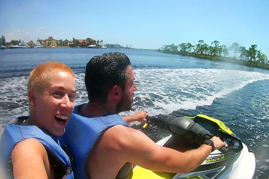 Was für den/das typische/n Coutryboy/-girl fast schon an der Tagesordnung steht, war für uns absolutes Neuland. Als wir einem Insider-Tipp folgen und zur geführten Jetski-Tour durch die St. Andrew Bay vor der Küste von Panama City Beach aufbrechen, ist uns daher etwas mulmig zumute. Zwei Stunden, rund 17 Kilometer und einen Zwischenstopp auf Shell Island später, schreien Laurens und ich vergnügt um die Wette, während wir mit Volldampf an luxuriösen Strandvillen vorbeisausen. Da können selbst die Delfine, die wir unterwegs antreffen, nicht mithalten. Dass der Rest der Truppe längst aus dem Blickfeld verschwunden ist, wird bei diesem Florida-Highlight schnell zur Nebensache.